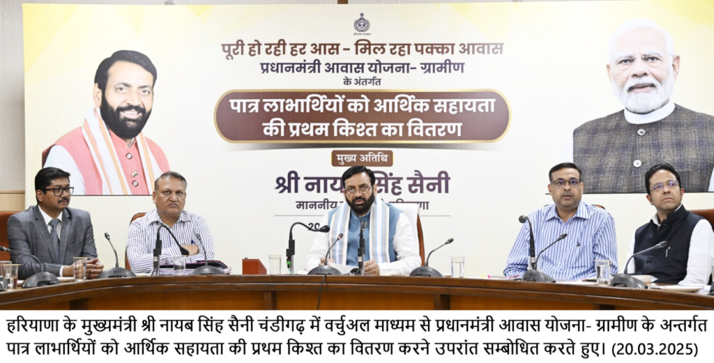 चंडीगढ़ 20 मार्च – हरियाणा के मुख्यमंत्री श्री नायब सिंह सैनी ने आज प्रधानमंत्री ग्रामीण आवास योजना के तहत अपना पक्का मकान बनाने के लिए आर्थिक सहायता के रूप में प्रदेश के 36000 पात्र परिवारों के खातों में 151 करोड रुपए की पहली किस्त जारी की । योजना के तहत पहली किस्त के रूप में प्रत्येक पात्र परिवार को मकान बनाने के लिए 45000-45000 रुपए की राशि ट्रांसफर की गई।