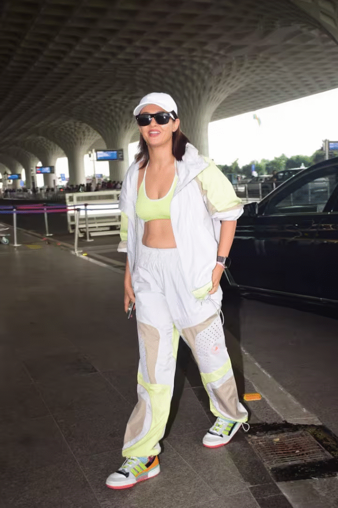 सुरवीन चावला का एयरपोर्ट लुक इस बार काफी स्पोर्टी और ट्रेंडी नजर आया। उन्होंने नियॉन ग्रीन ब्रालेट को व्हाइट और नियॉन डिटेल्स वाले ट्रैकसूट के साथ स्टाइल किया था। इसके साथ उन्होंने मल्टीकलर स्नीकर्स, व्हाइट कैप और ब्लैक सनग्लासेस पहनकर अपने लुक को और भी ज्यादा कूल और स्टाइलिश टच दिया।