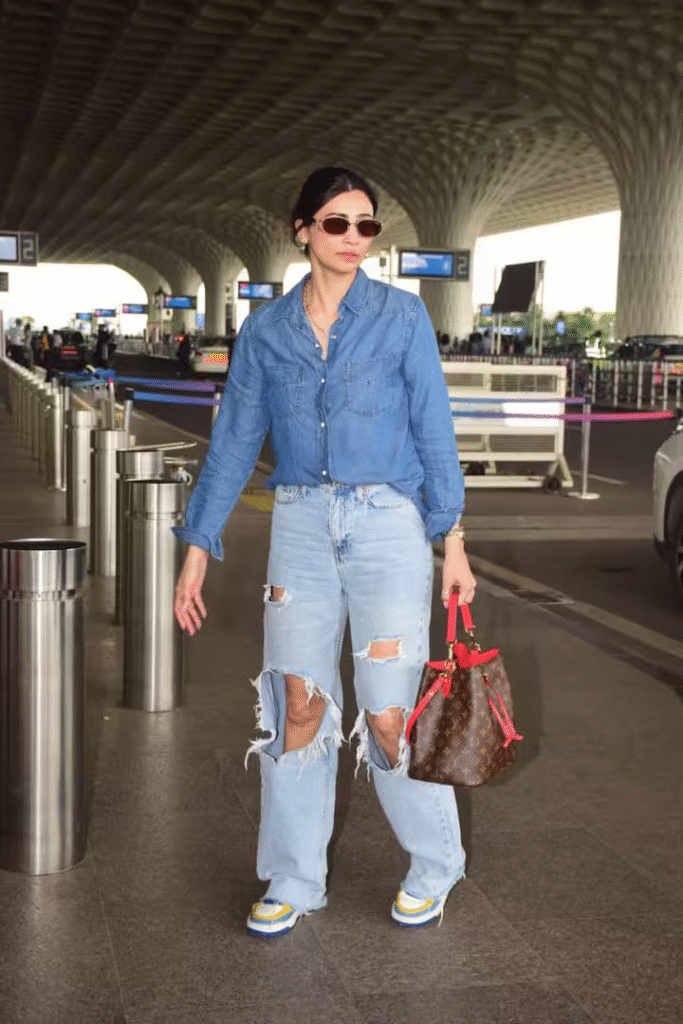 डेज़ी शाह का एयरपोर्ट लुक इस बार ट्रेंडी और कैज़ुअल दोनों ही नजर आ रहा है। उन्होंने ब्लू डेनिम शर्ट के साथ रिप्ड डेनिम जींस पहनकर डेनिम-ऑन-डेनिम स्टाइल को बखूबी कैरी किया। उनके कलरफुल स्नीकर्स और ब्राउन-रेड कॉम्बिनेशन वाला बैग उनके लुक में स्टाइल का तड़का लगा रहे हैं। वहीं सनग्लासेस ने उनके पूरे अंदाज़ को एक कूल और स्मार्ट टच दिया है।