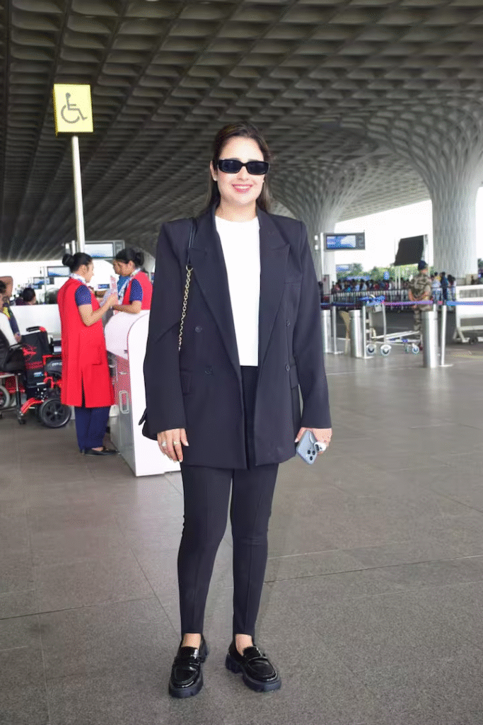 युविका चौधरी का एयरपोर्ट लुक इस बार क्लासी और मॉडर्न दिखाई दिया। उन्होंने व्हाइट टॉप के साथ ब्लैक ब्लेज़र और ब्लैक पैंट्स पहने थे। उनके ब्लैक शूज़, चेन बैग और स्टाइलिश सनग्लासेस ने इस लुक को और भी एलिगेंट और सॉफिस्टिकेटेड बना दिया है।