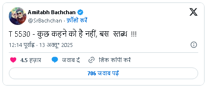 एक व्यक्ति ने कहा कि शिक्षा और संस्कार दोनों जरूरी हैं। एक आदमी ने एक ट्वीट किया, “जया बच्चन का वर्जन।” वहीं, एक और व्यक्ति ने लिखा, “यहाँ अमिताभ बच्चन को जया बच्चन से बदल देना चाहिए।” अमिताभ बच्चन ने एक ट्वीट शेयर किया है और उनकी प्रतिक्रिया से जान पड़ रहा है कि उन्होंने बच्चे की हरकत पर विचार किया है। अमिताभ बच्चन ने लिखा, “कुछ कहने की आवश्यकता नहीं है, मैं शांत हूँ।”
