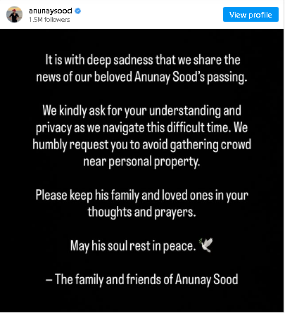 अनुनय सूद के आधिकारिक इंस्टाग्राम अकाउंट पर उनके परिवार की ओर से एक पोस्ट साझा की गई है। पोस्ट में लिखा गया, “अत्यंत दुख के साथ हमें अपने प्रिय अनुनय सूद के निधन की जानकारी देनी पड़ रही है। इस कठिन समय में हम सभी से सहानुभूति और निजता बनाए रखने का अनुरोध करते हैं। कृपया निजी संपत्ति के पास भीड़ जमा करने से बचें और परिवार व प्रियजनों के प्रति अपनी संवेदनाएं एवं प्रार्थनाएं बनाए रखें। ईश्वर उनकी आत्मा को शांति प्रदान करे।”
